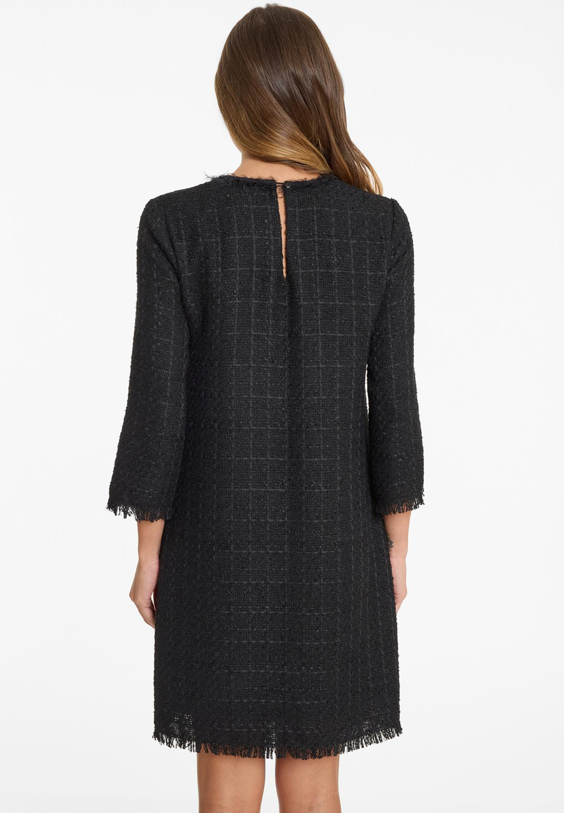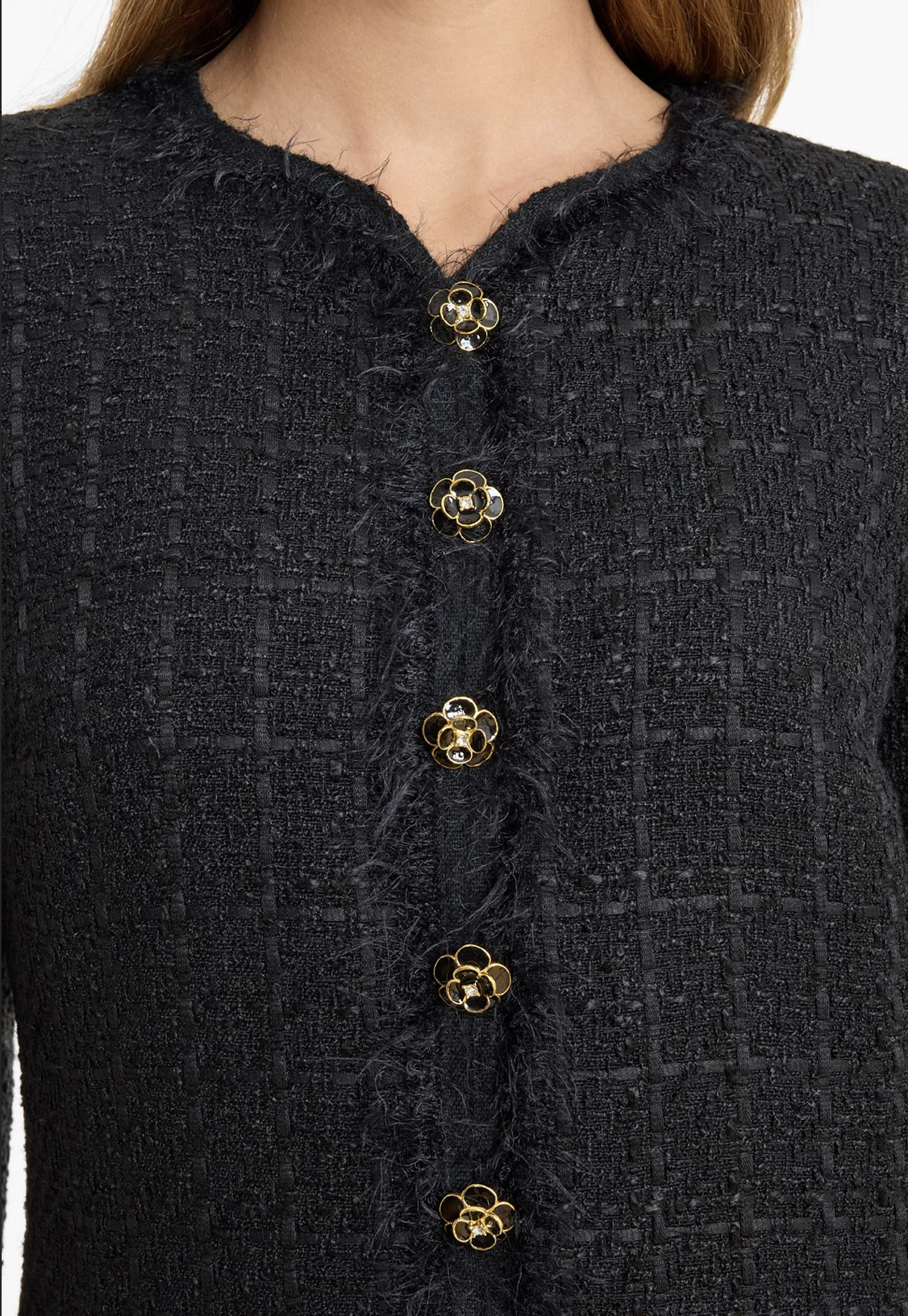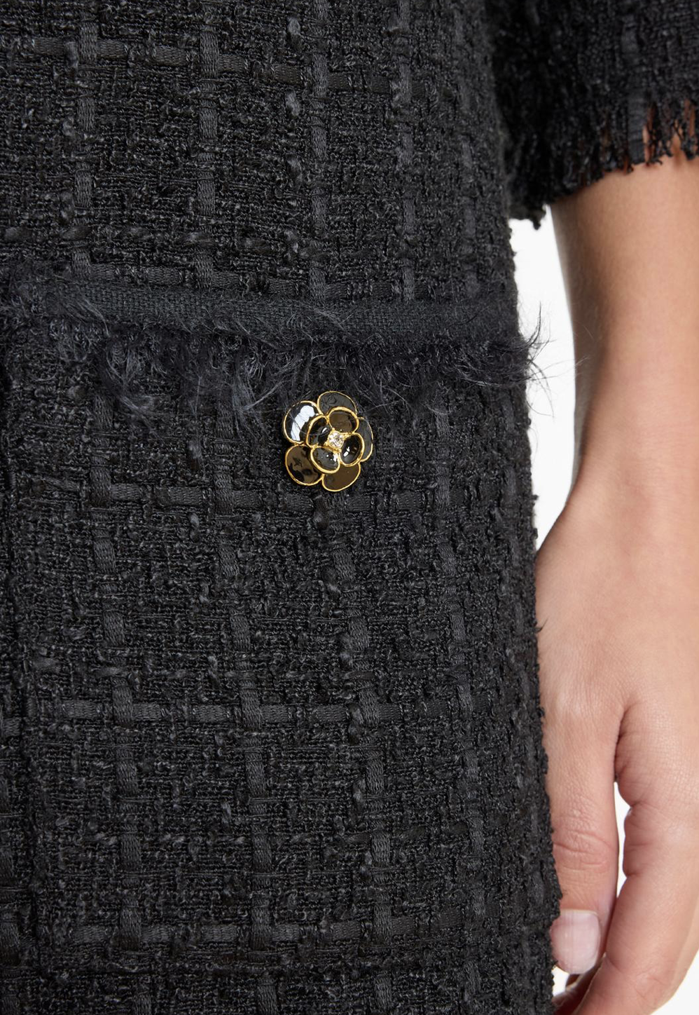 Bukleepintainen mekko on somistettu upeilla kullansävyisillä napeilla ja valetaskuilla.