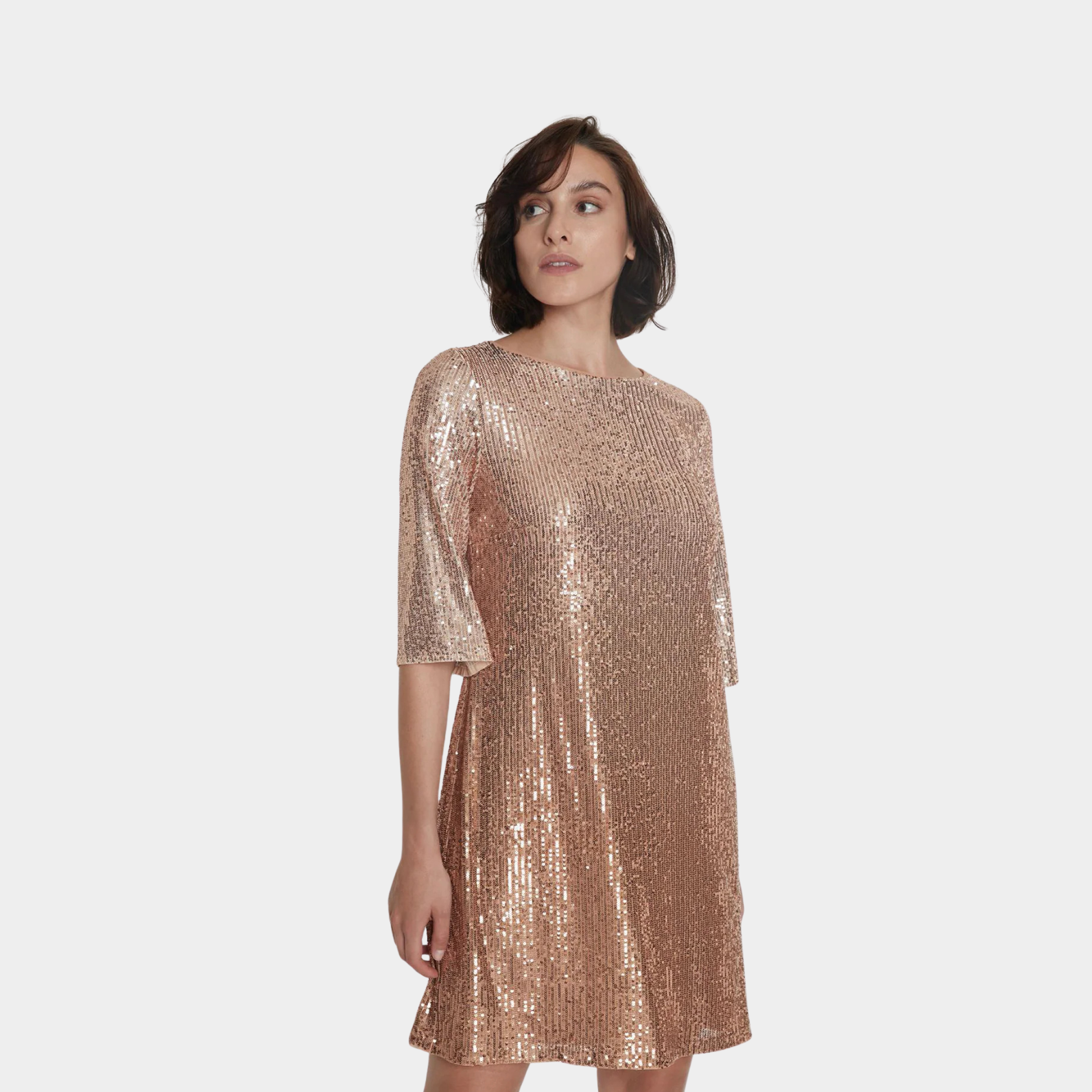 Paljetit ovat kiinnitetty kankaaseen joka tummunee helmaa kohden, tästä syntyy hento liukuvärjäys vaikka paljettien sävy pysyy samana koko mekon osuudelta.
